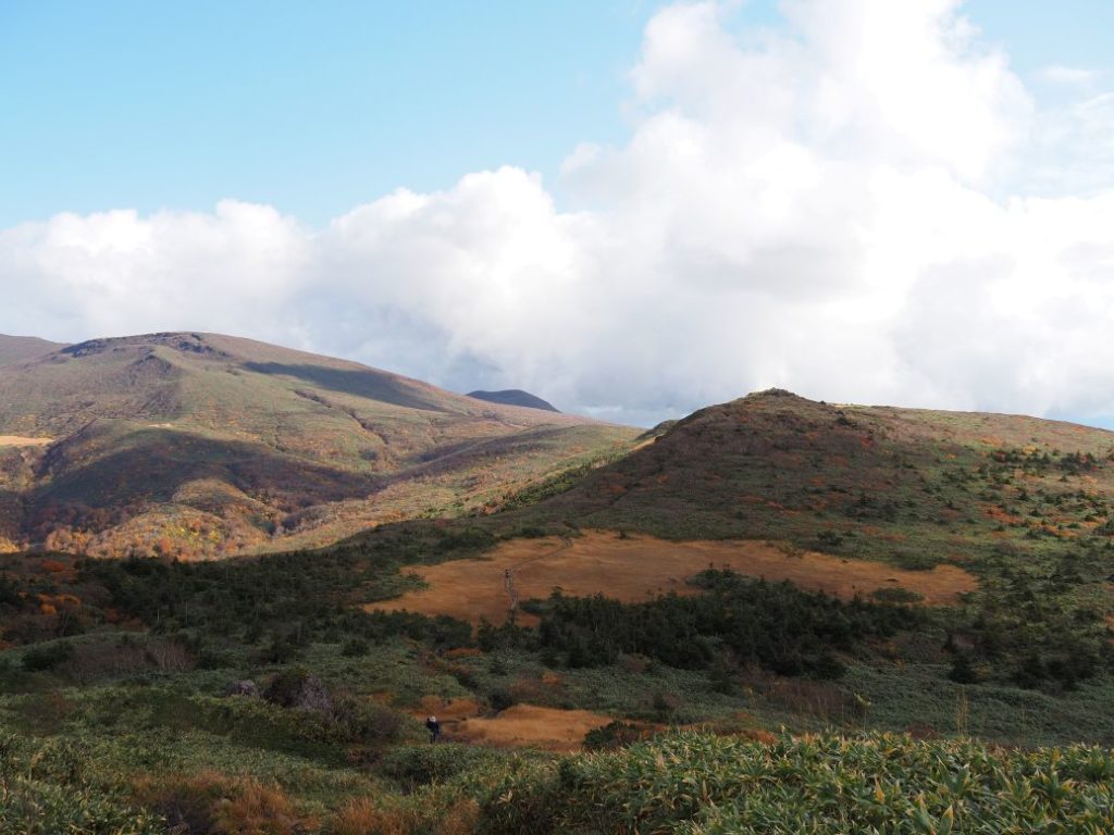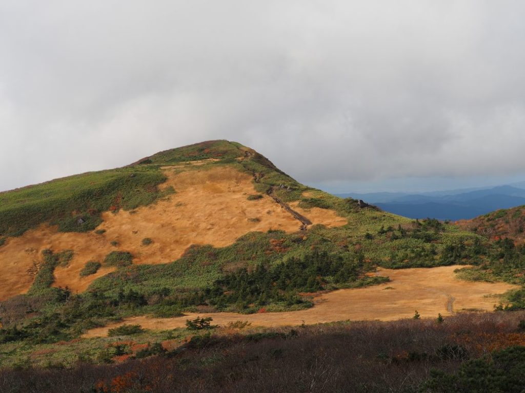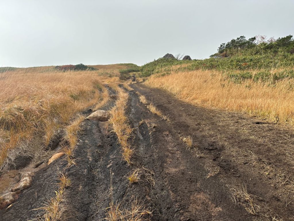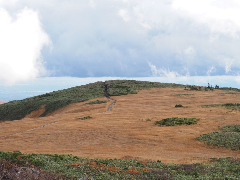 いつも悩ましい栗駒から来た時の最後の秣岳の登り。もう5列造成されました。こんなことなら、みんながばらけて草原を歩いた方がいいだろうと思う。ちなみにひろがった道ではなく、最初の頃の道の方が歩きやすくなっているので、横に広がらなくてもいいと思います。(放棄されたところから、植生が回復するならいいいけど、結局掘れたところはそう簡単には戻らないだろう)