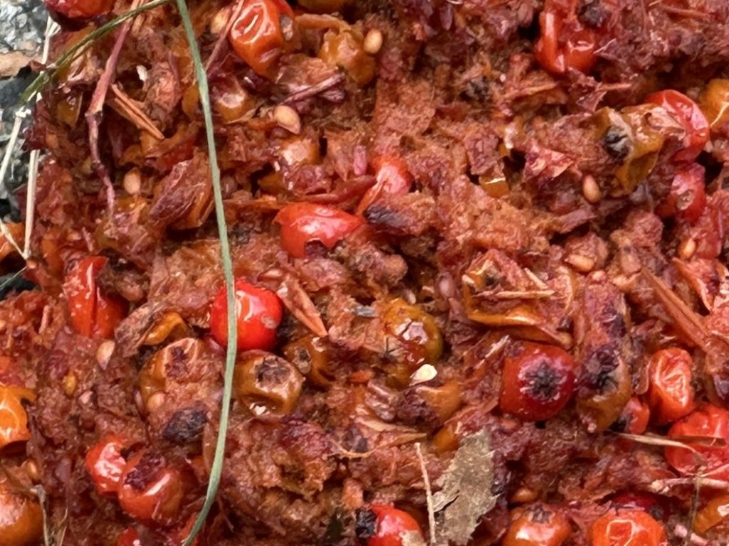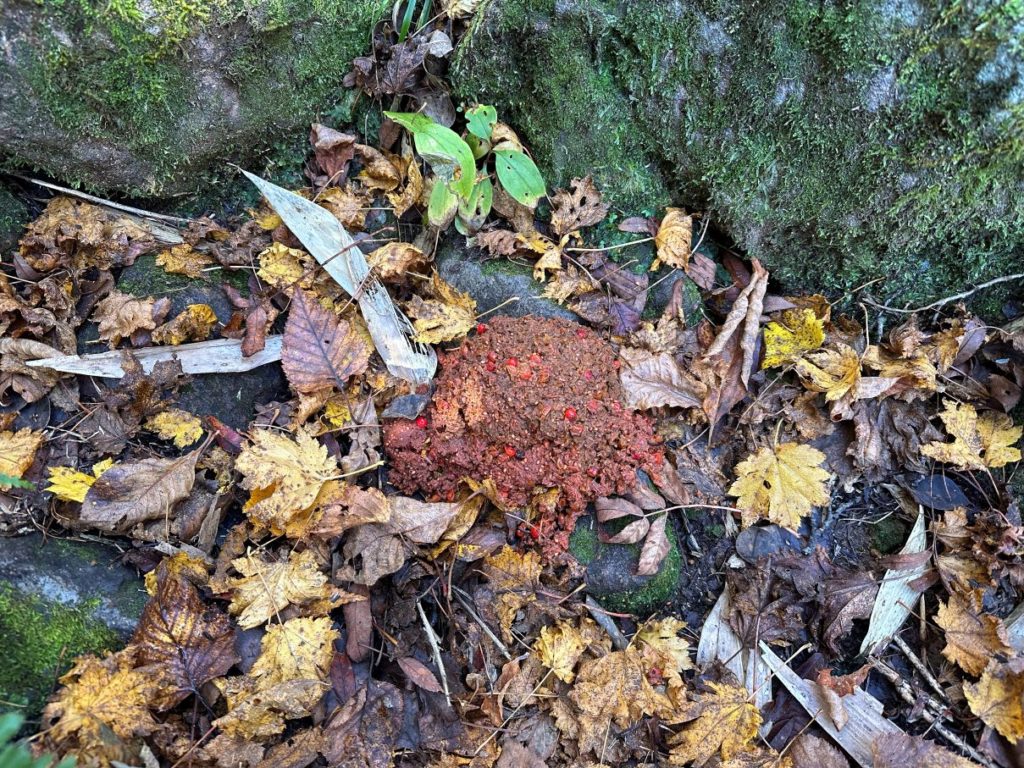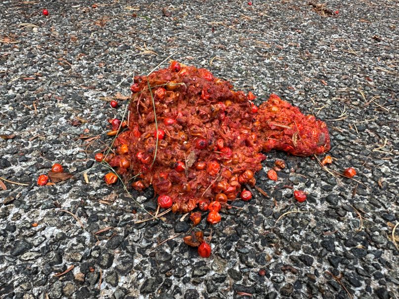 この前のと見比べてみると・・・この前のもやはり糞なのかなという気もしてくるが、あまりに未消化な状態であり、かつ、熊棚を作って食べた足元でもあり、ナナカマドの根元にあちこちまきちらかしていたこともあり。