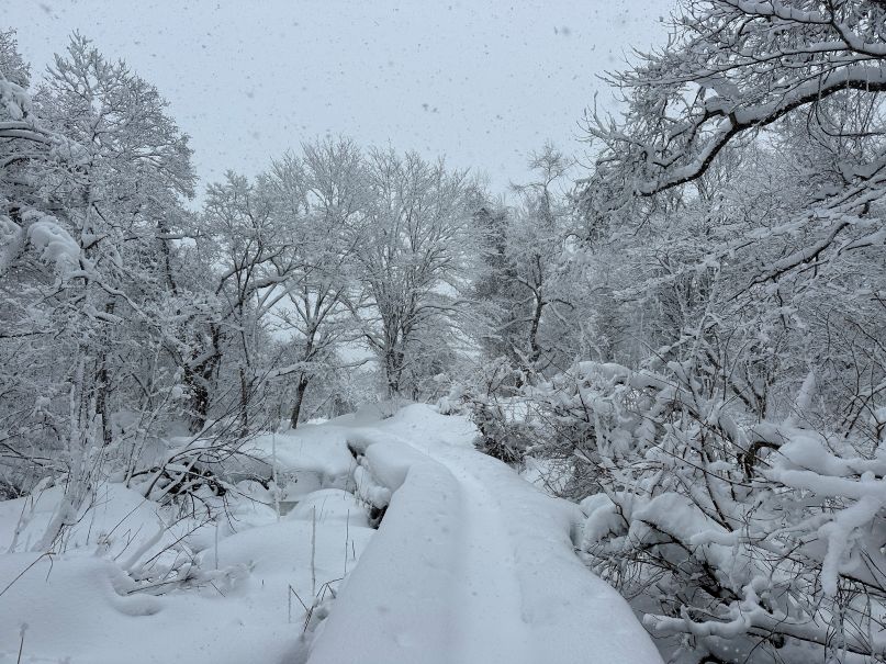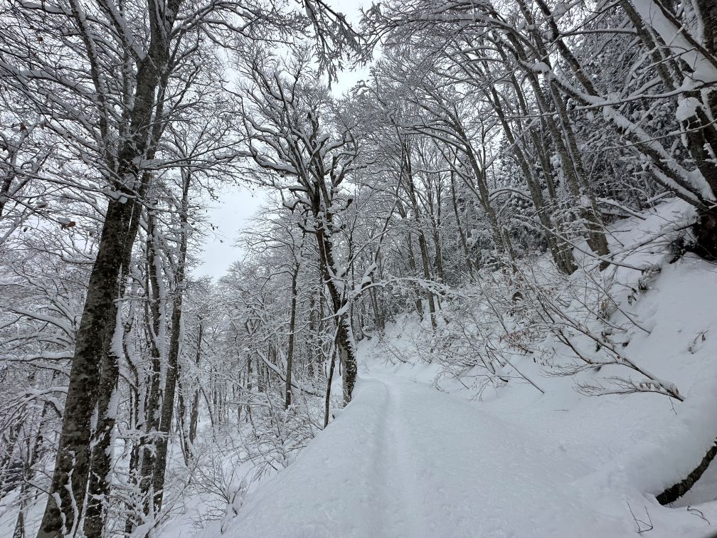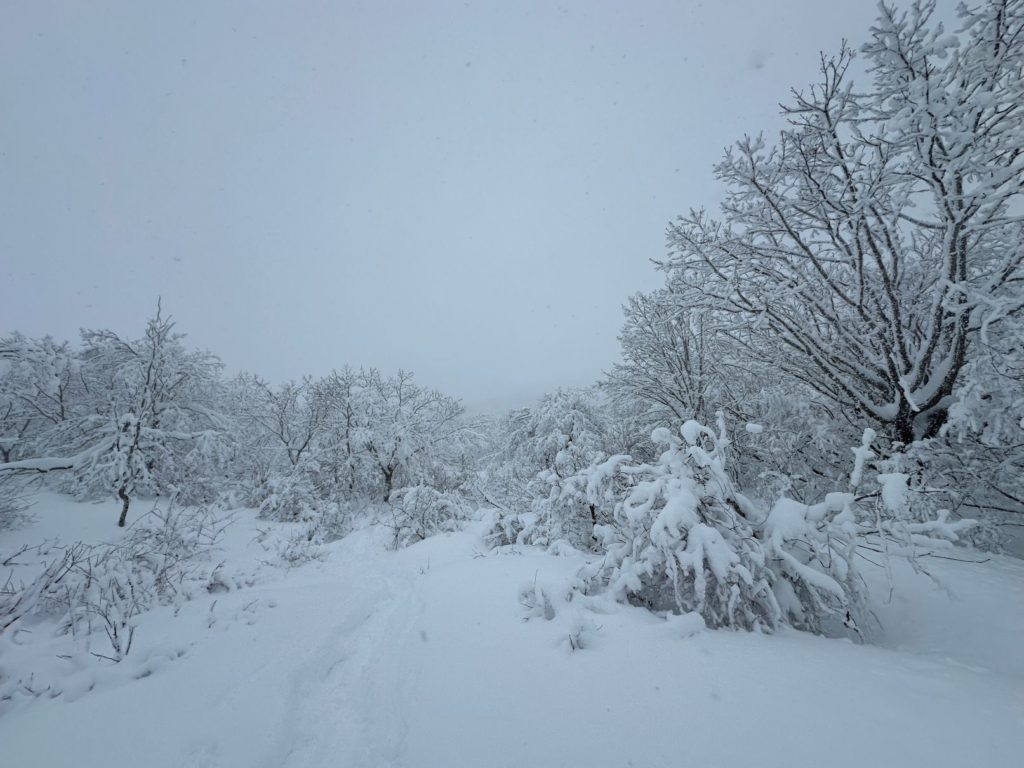 一月上旬、吹雪くわけではなく、雪は軽く舞う程度だし、気温もそんなに低くない。かと言って、青空があるわけじゃない。でも、まあまあスノーシューには悪くないんじゃないか。