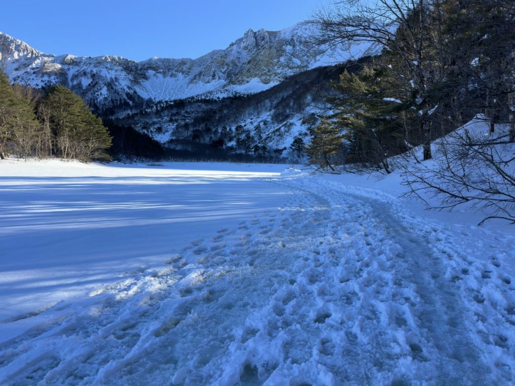 いつ来ても美しい銅沼。沼の脇のトレースは少し水が上がってきている。
