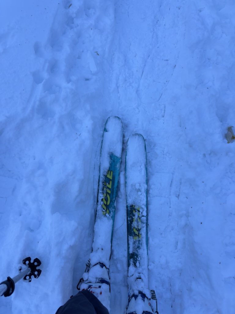 時間は午後2時近くなので、下から歩くのはやめ。どうせリフトに乗るのならスキーかなということで、駐車場で3年ぶりのテレマークスキーの準備。(前日に、靴の確認などはしてきたものの)靴を履くにも、板をつけるにもまごまごしたが、とりあえずリフトに乗り込み無事にリフト終点へ。