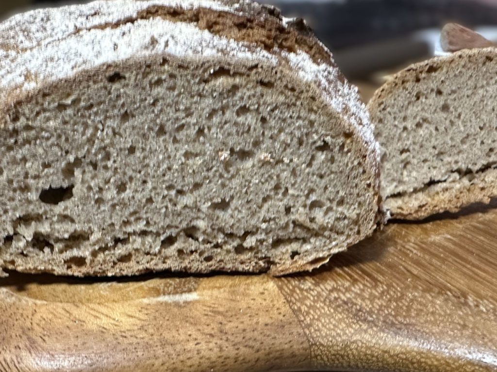 パンは、全体に少し増量し、お湯で捏ねて、エアコンの下で2時間程発酵時間を取ってみた。焼く前の蒸気も少し真面目に入れてみた。(予熱後の天板にお湯を少し注いだだけだが)