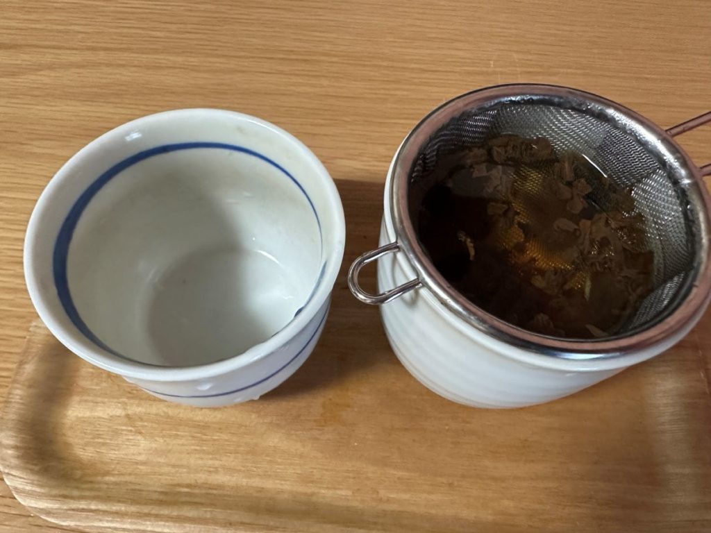 さて、お茶を飲む時に急須を使うのが面倒で、湯飲みサイズの茶こしを使っている。急須の中にお茶が残ったりしないのでいい手だと思っている。先日は紅茶でもこの技を使ってみた。いい手だと思う。