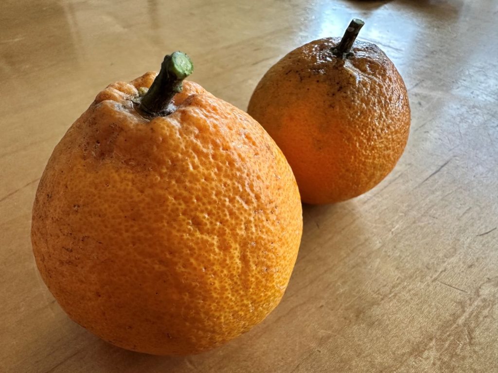 多分、もう10年ぐらいにはなるベランダの不知火(デコポン)。元々は沖縄旅行で食べた種を播いたものの全然花も付かなかったシークヮーサー。何年もして花も咲かないので、不知火の苗を買い、ついでに接ぎ木したら花が着き始め、数年前から実も付くようになった。本家の不知火は養子に出し、今はこちらの一本。 まともに水やりもできない時期も乗り越え、今年はどうにか3つ結実。これがまあ美味しいんだな・・・ちょっとしかできないけど。