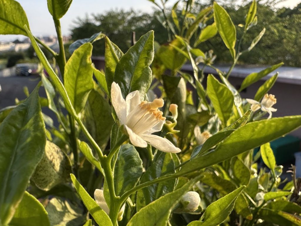 不知火に加えて、苗を買って3年目ぐらいの柚子も咲き始めた。