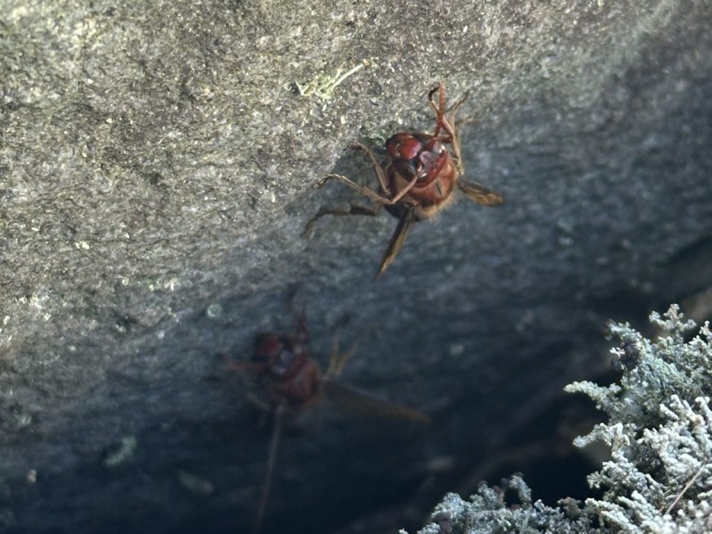 石組みの隙間に巣を作っているらしいチャイロスズメバチ。(というか、撮影してみて確認したのですが)スマホしかなかったんで、ぐっと近づいて撮影。警戒されることもなく、警告されることもなく、全然気になってなかったみたいなんで・・・(写真はトリミングしているので、更にアップしている感じですが)