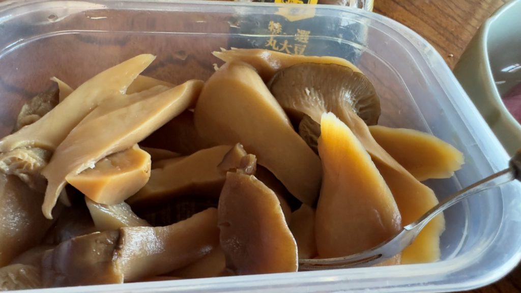 たばこの時間には、お手製の小豆でっちを頂き、昼ご飯まで頂いてしまいました。お昼に出てきたのが、「エリンギの味噌漬け」。なんか洋風な感じのあるエリンギですが、味噌漬けで食べるのは初めて。湯がいてから味噌に漬けるだけだそうです。美味しくいただきました。それに、なんか新しいエリンギ料理が開発できそうな気がする。