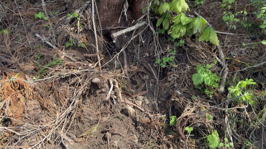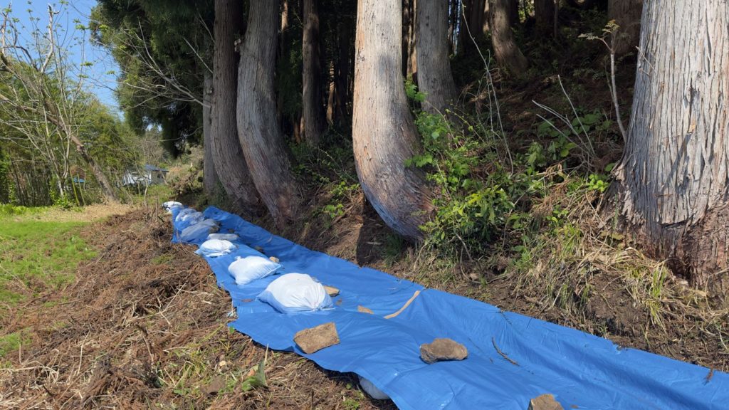 もう田んぼの季節も近いというのに、堰がイノシシによって崩され、今日はその箇所だけ、急遽修繕。イノシシは堰の脇のスギの根元を掘り返し、更に堰の一部も掘り返したようです。で、堰を均平にし、ブルーシートと土嚢でとりあえず修繕。