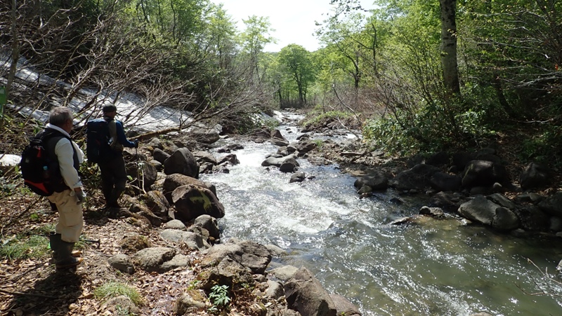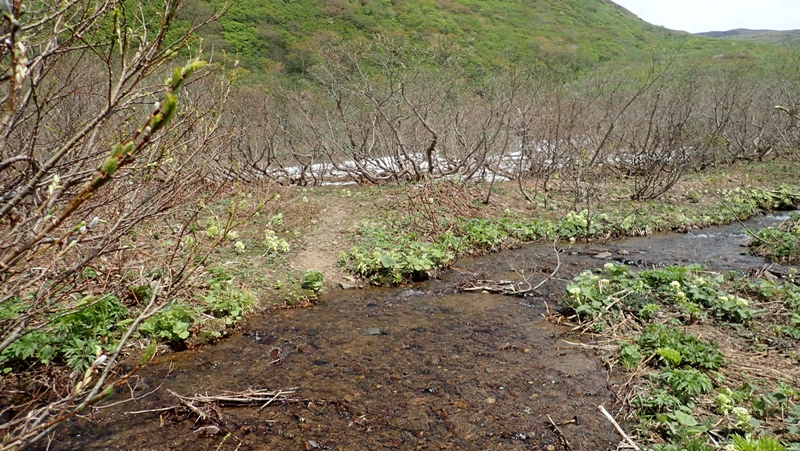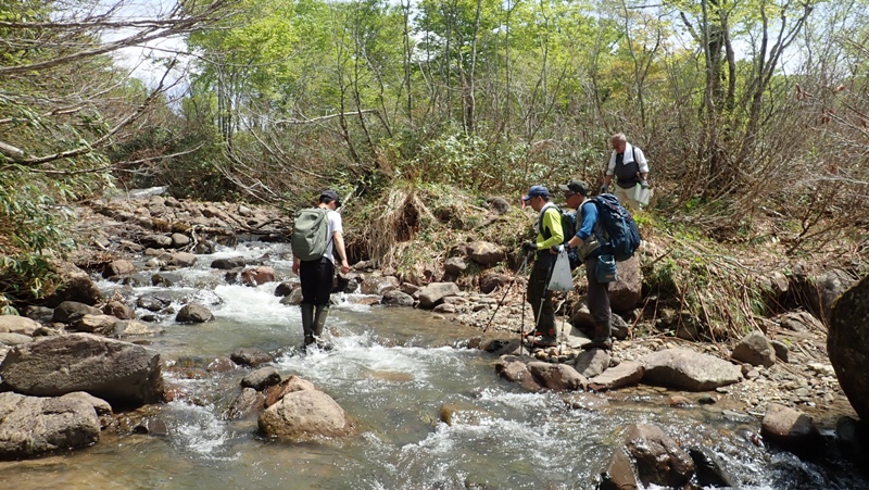 沢の方に下って渡渉点:雪の残るところを渡ってから、3回沢を渡りました。(10:30-10:50ぐらい)。長靴の方は水が入ることもなく、無事に横断。ストックを使って、安定させながら渡る方がよさそうでした。ゴアの軽登山靴にロングスパッツでむかった私は、ちょっとミスって登山靴は水没。