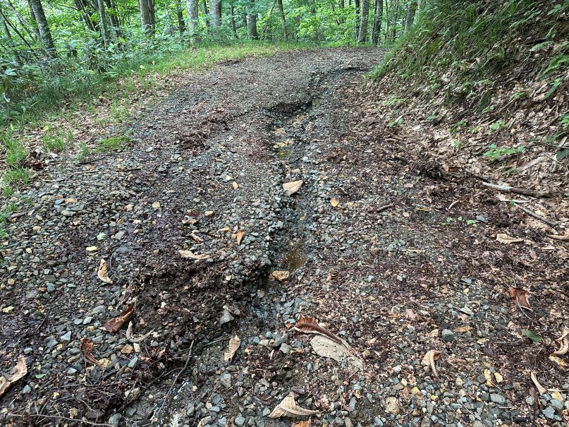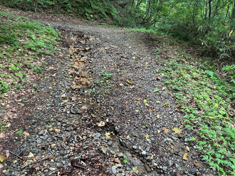 林道は、標高500mぐらいのところかな、深くえぐれているところがあり、そこの課題をクリヤーできればあとは急だけど登れるかと思います。落ち葉がだいぶ流された分、路面が把握しやすくなっているようにも思います。何にしても軽トラやジムニー系以外の車にはお勧めしない林道だと思います。