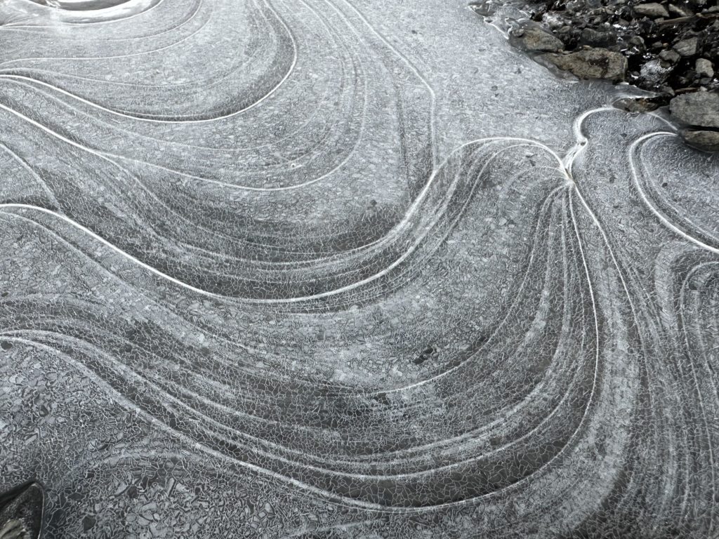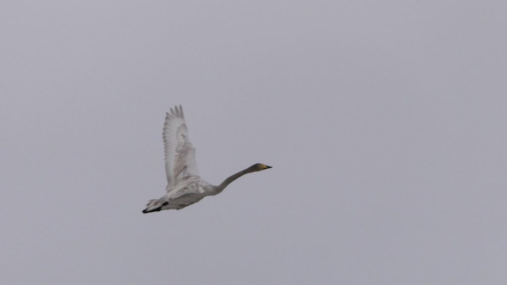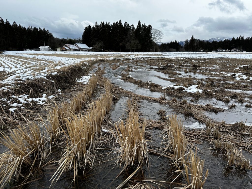 既に雪は降り止んでいたものの、風が強く、寒い朝。ニットの帽子も、手袋もしてこなかったことを悔やみつつも、面倒なので、少し散歩をする。冷たい風を顔に受けながら、この地域の家屋に「いぐね(居久根)」(防風林)が作られている意味を、あらためて感じさせられる。 しかし寒い。あぜ道の水たまりは凍り、どこからか白鳥が1羽飛び立った。