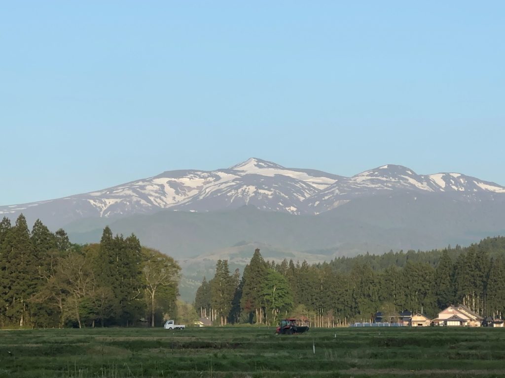 朝、久しぶりに散歩。栗駒の残雪が描き出す「本寺ギツネ」はこの頃が1番元気な姿なのだろうか?本寺ギツネの栗駒を背景に、朝から田起しをするトラクターがいたので、少し撮影させてもらいました。