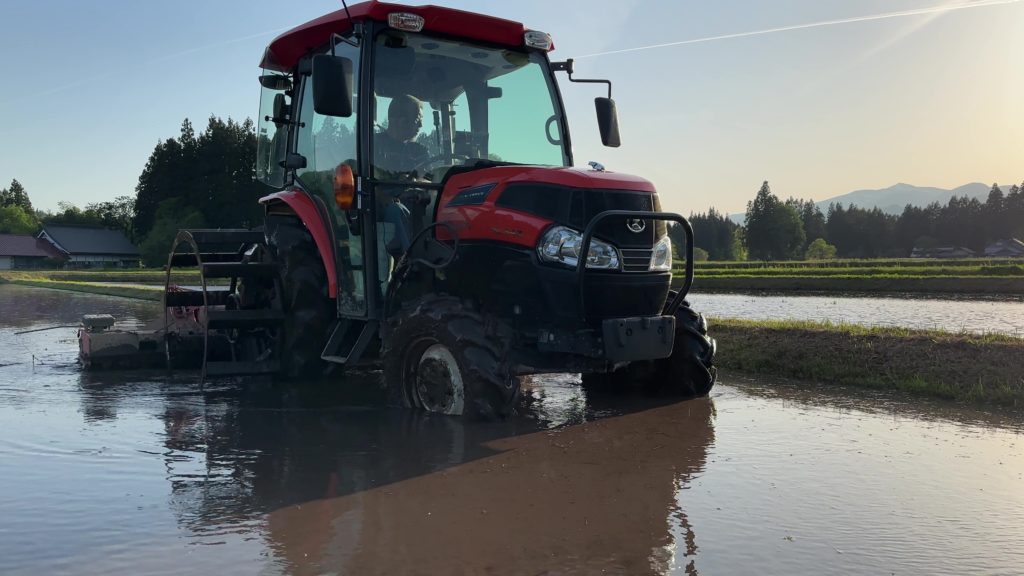 5月4日。GWはGolden Shirokaki WeeKとして、代かきに明け暮れるという。日が傾くまで代かきをした後、戻ったら、毎日、トラクターの泥をしっかり落とすのだという。農機具も大切に扱わないと傷むのが早いという。