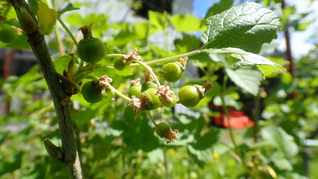 ブルーベリーも成長中。鳥との闘いに向けてあれこれ検討中。ハウスの脇にあるのはカシスかな。