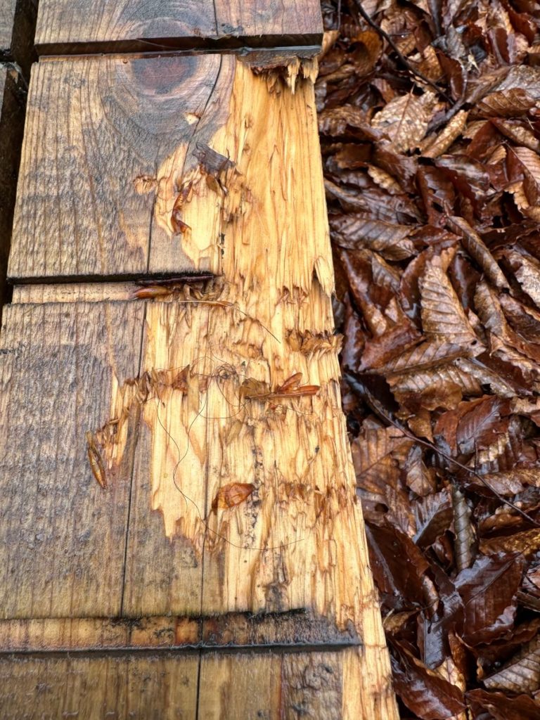 野鳥の森は、木道に入るなり、クマがかじったらしき痕。嫌だなと思いつつ、少し声を高めて歩く。手には、この前中古で買った大きくて重い雲台がついた一脚。