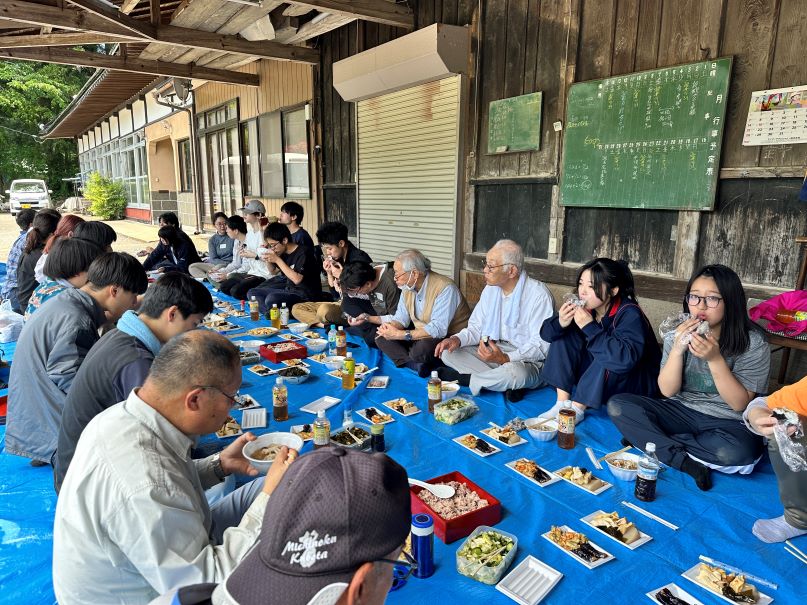 國學院大學の学生たちが参加した田植え体験が行われました。地域の皆さんの見守る中、大学生は楽しそうに田植え。そして、みんなで昼ご飯。