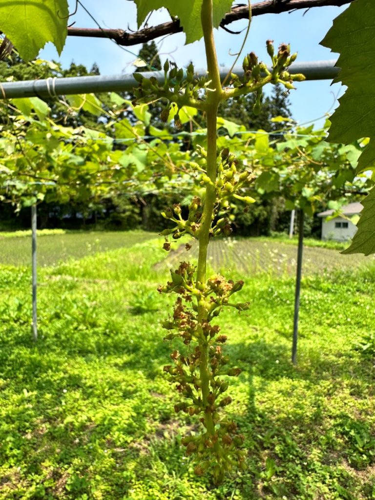 ブドウの開花が進み、ところどころ花ぶるいのよう。