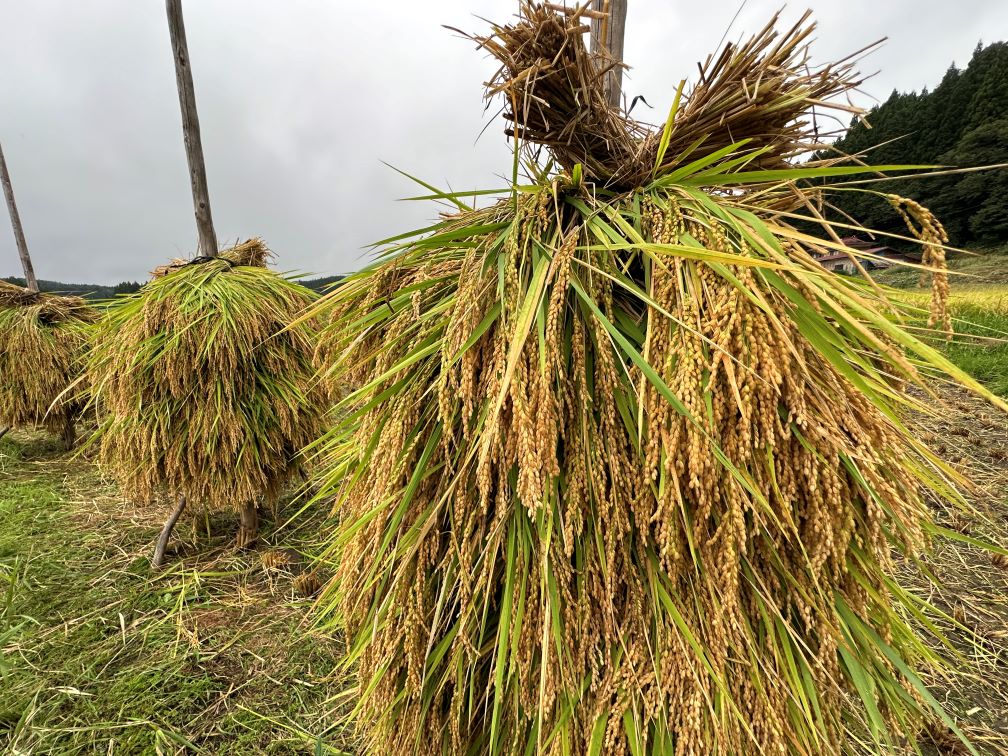 ほんにょも、高さを抑えて、どんどん立てていく。杭の本数は増えるけど、低めに作った方が効率的で、速く仕上がるとのことでした。ちなみに足は2本。上は、二つに分けた稲束を5段ぐらい組み上げたかな。(細かいところは後日、動画で)