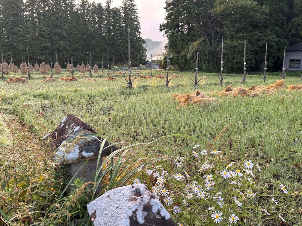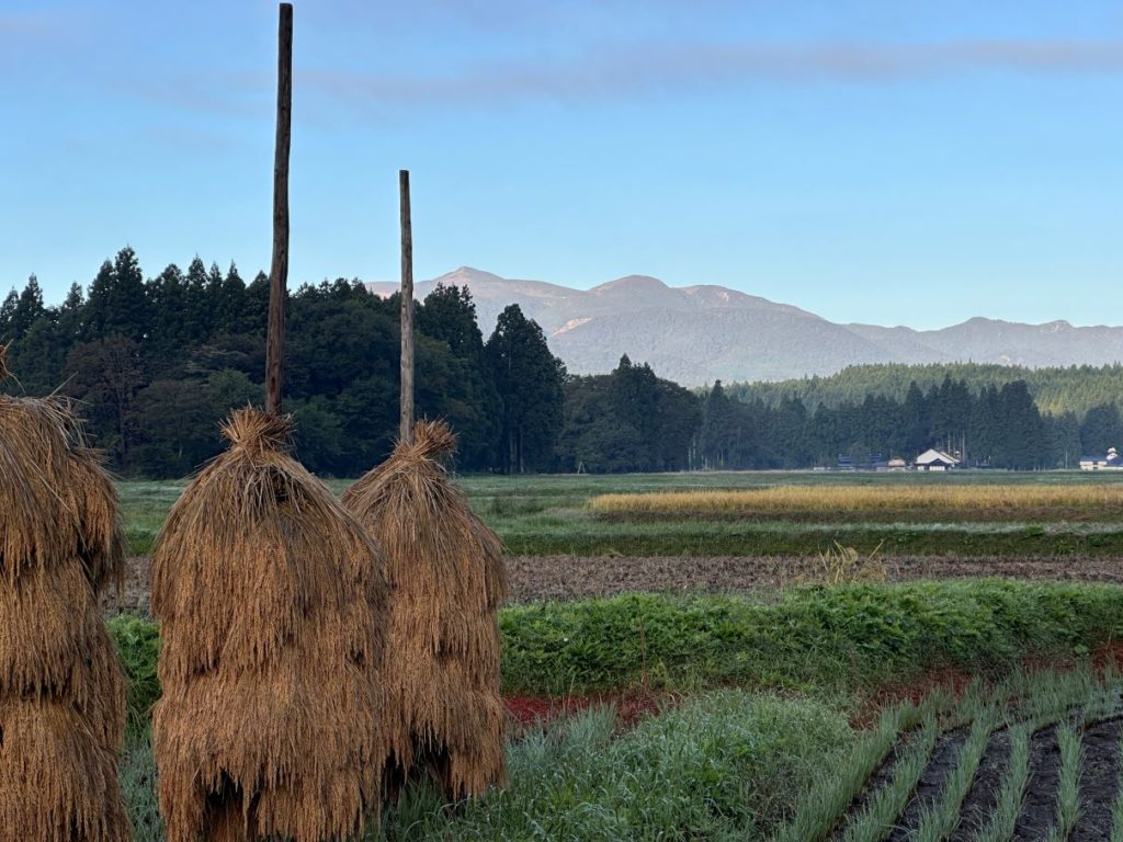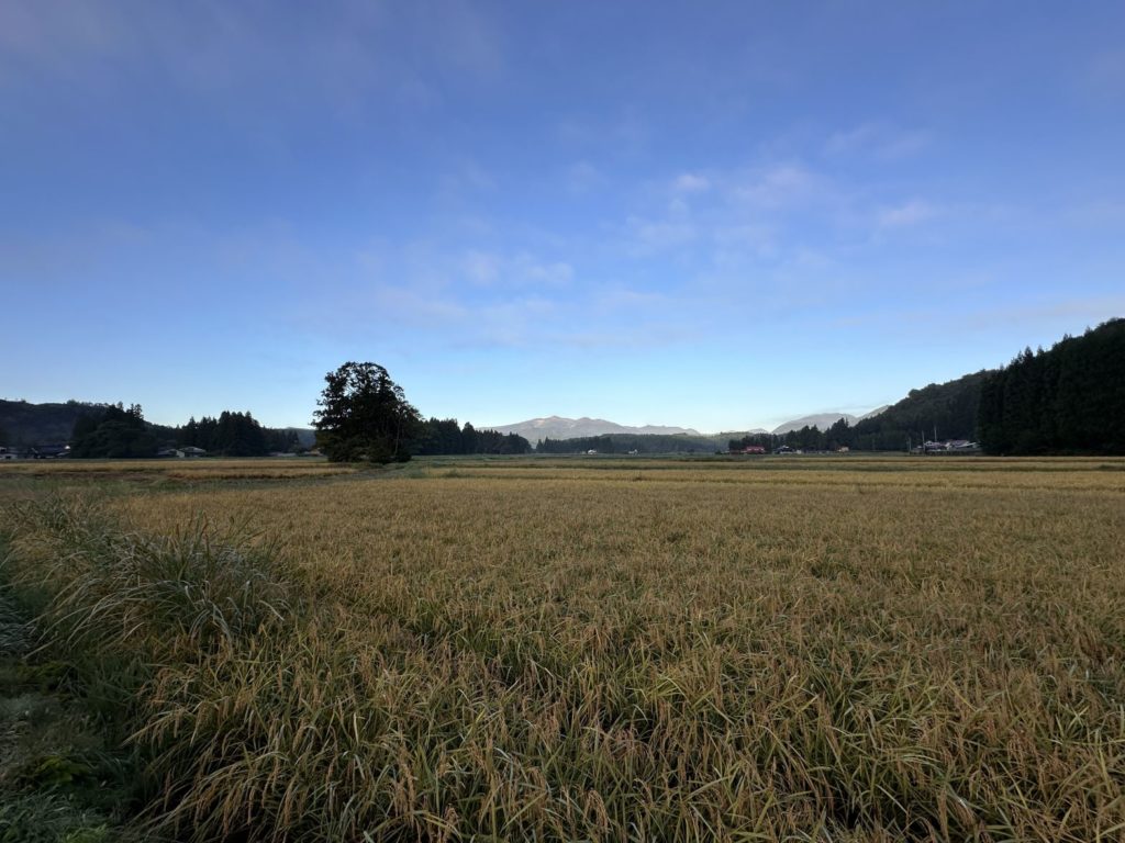 多分、数日中には稲扱きが進んで消えていくほんにょ達と栗駒山の姿。