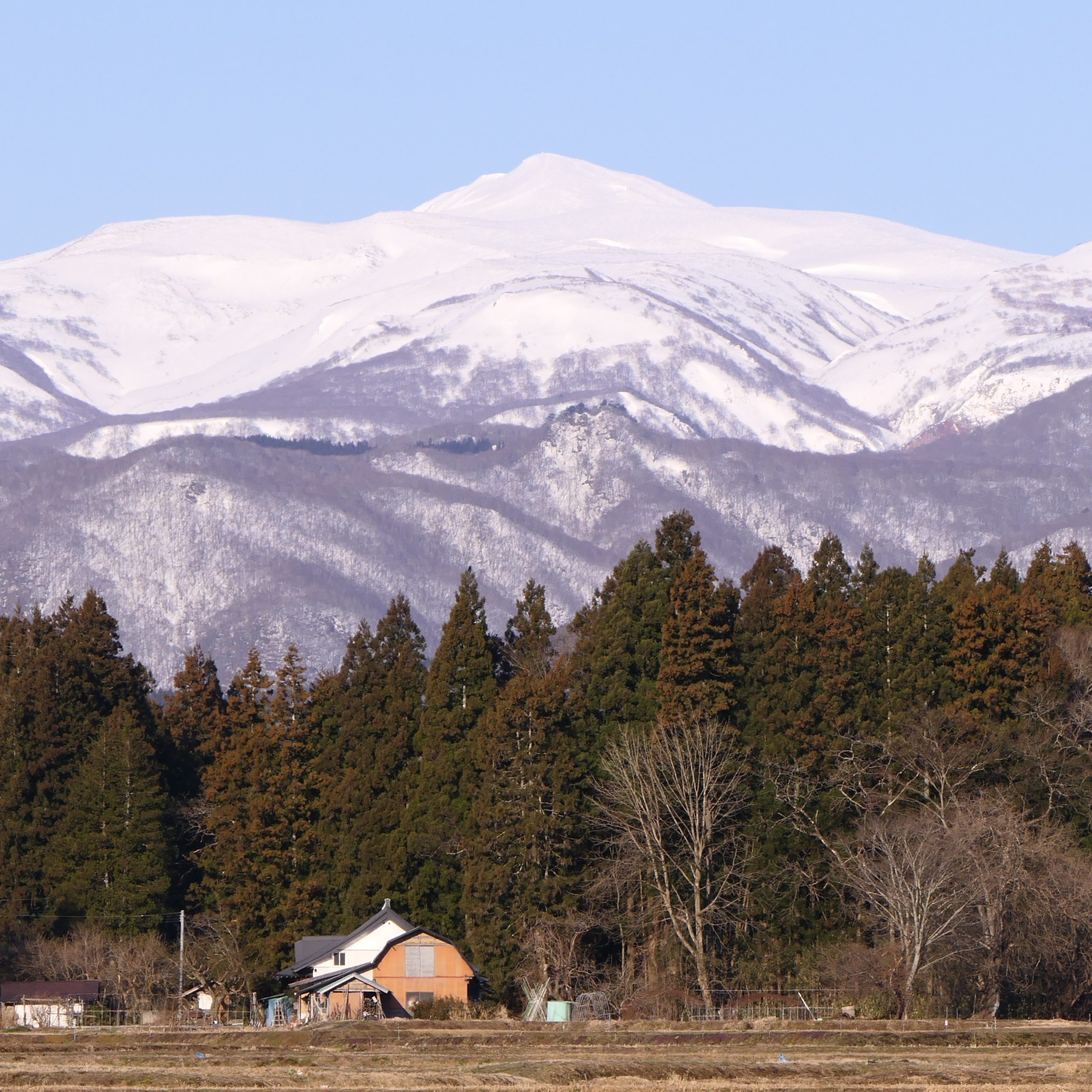 防風林である「いぐね」のある本寺地区の住居と須川岳(須川岳は三角点では「酢川岳…