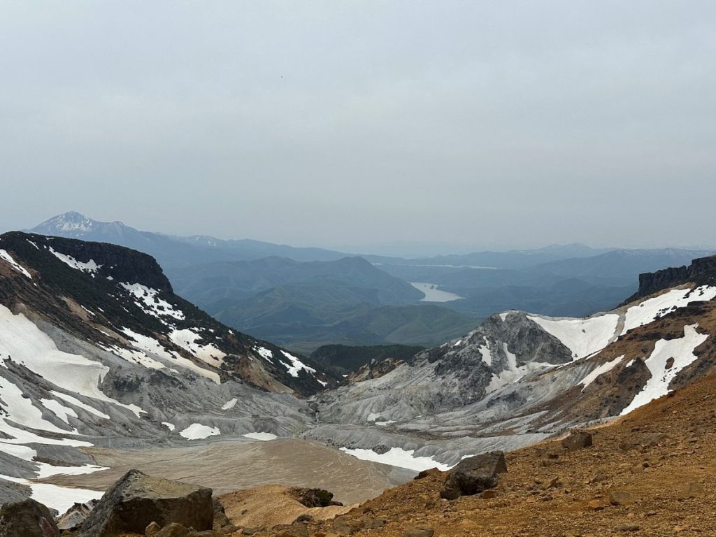 で、安達太良山がどんなところかそもそもわからない時にはグーグルマップを見るのがいいかもしれない。白く平坦な所が沼ノ平火口。