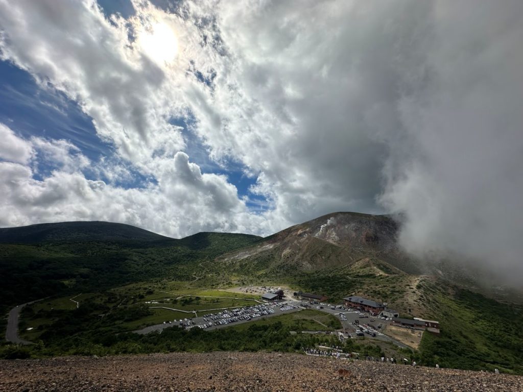 磐梯山の登山道の途中から、夕方の猪苗代湖。太陽は背中側に沈んでいくので、この時期ではないのだろうけど。